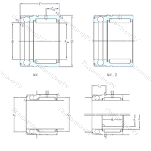 Малогабаритная конструкция Подшипник комбинированный NX15 представляет собой совмещение игольчатого радиального роликоподшипника и упорного подшипникового тела качения (роликового или шарикового). В качестве упорной части может идти сепаратор, в то время как иные варианты поставляются без данного элемента. Также существуют фланцевые и бесфланцевые разновидности со стандартным или удлиненным тугим кольцом.