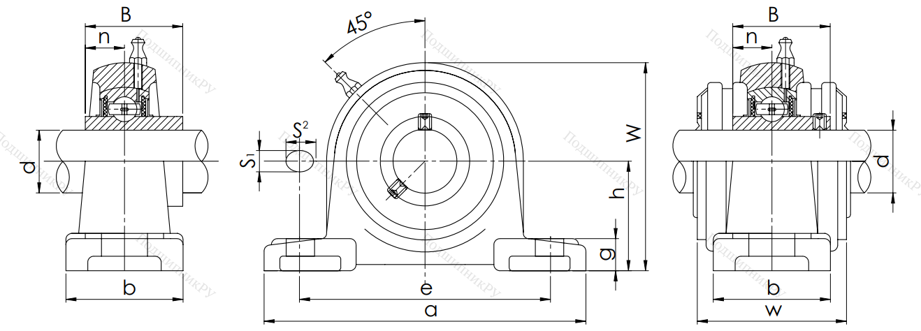 В конструкцию детали входит корпусный подшипник типа UC, установленный в корпус типа Р из чугуна с нишей сферической формы. Монтаж на вал осуществляется посредству кольца, оснащенного парой штифтов, закручиваемых шестигранником, что обеспечивает самовыравнивание.
